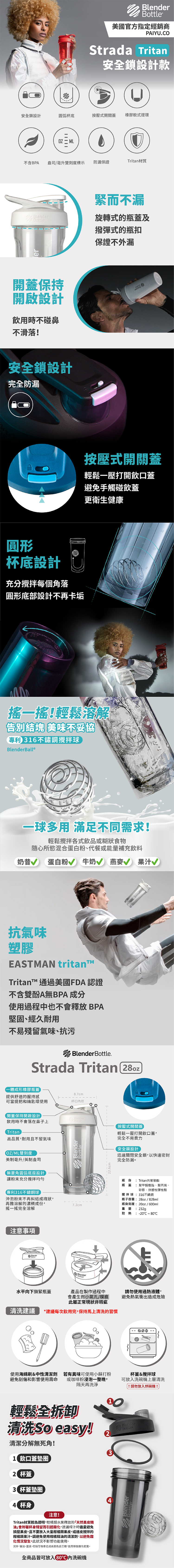 Blender Bottle 為搖搖杯設計,瓶蓋無法釋放壓力,若裝入過熱或有氣液體,開蓋時可能因壓力導致液體噴出,請務必先旋開瓶蓋釋放壓力,避免燙傷。
